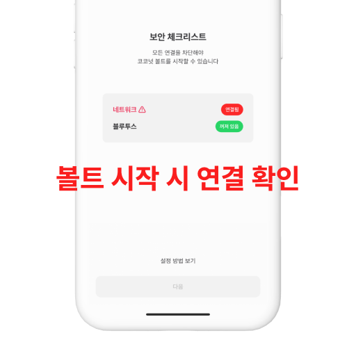코코넛 볼트는 스마트폰에서 실행되는 하드웨어 월렛과 같은 강력한 보안 기능을 가진 앱입니다. 와이파이, 블루투스, 셀룰러 데이터, 유심 등 모든 네트워크 연결을 차단한 ‘공기계’(오프라인 상태의 스마트폰)에서만 동작하도록 설계되어, 인터넷 해킹 위험으로부터 완벽히 자유롭습니다.