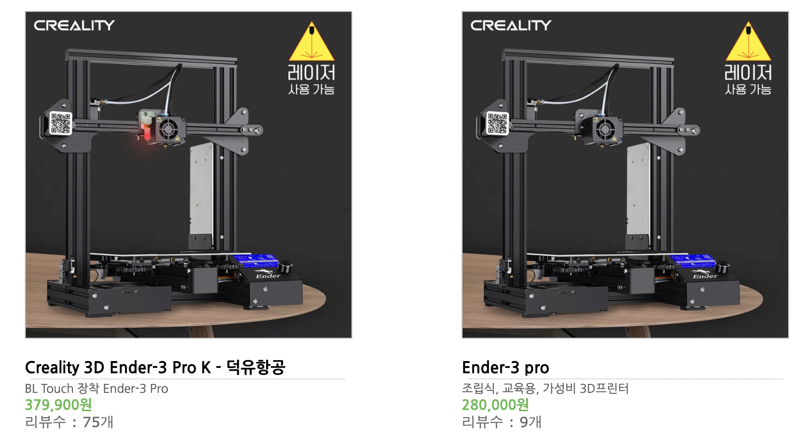 엔더3 프로 제품이 30만원 이하에서 살 수 있는 가성비 프린터라고 볼 수 있습니다. 적당한 출력 크기, 적당한 가격, 준수한 퀄리티를 바탕으로 많이 팔린 제품입니다.