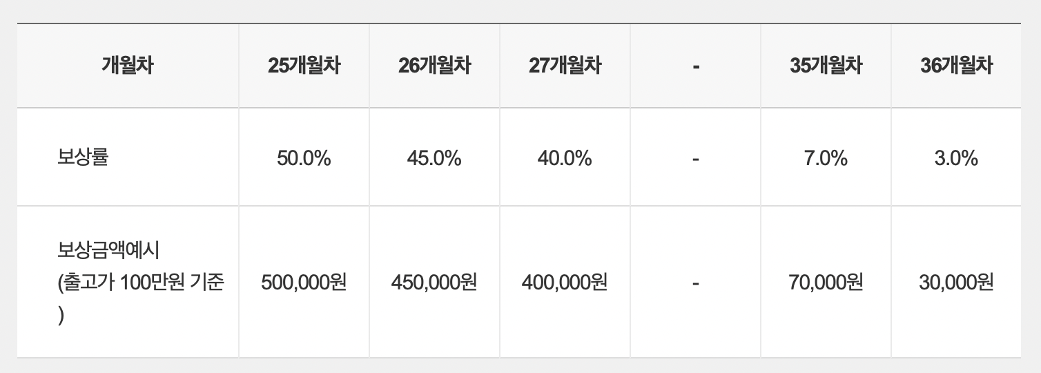 그럼 지금이라도 슈퍼체인지를 해지해야 하는 것일까요? 일단 아래의 보상률을 보면 1년이 지난 후가 50%로 가장 높은 보상을 받을 수 있다는 점을 알 수 있습니다.