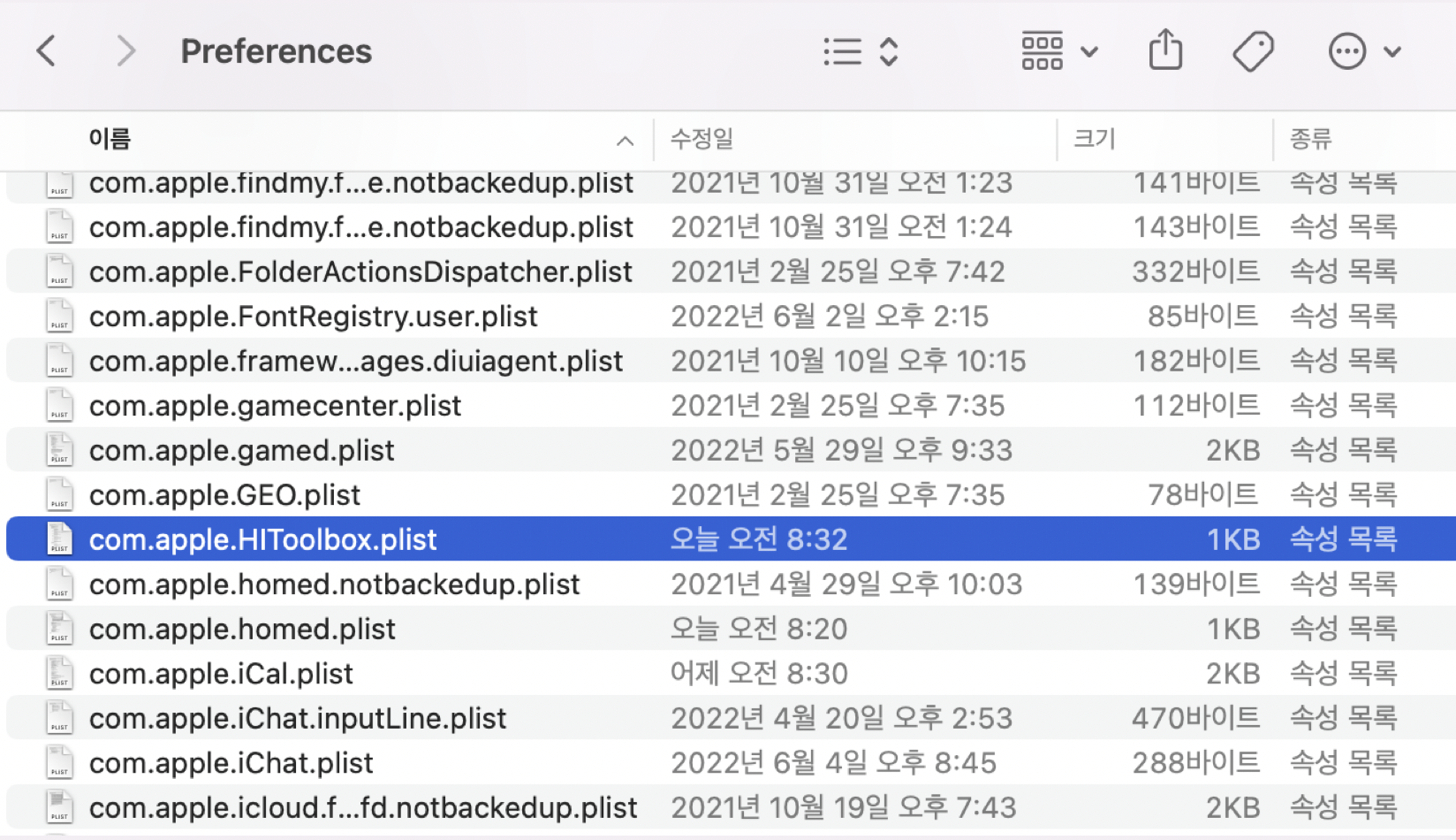 Preferences 폴더에 들어가서 위의 com.apple.HIToolbox.plist 파일을 삭제해주면 된다.
