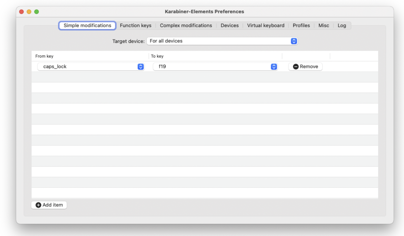 이 후에 Karabiner를 실행한다. 실행한 후에 caps_lock 키를 f19 키로 세팅을 한다.