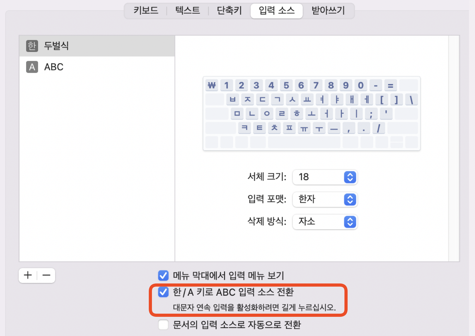 위와 같이 한/A 키로 ABC 입력 소스 전환에 체크가 되어 있어야 한다.