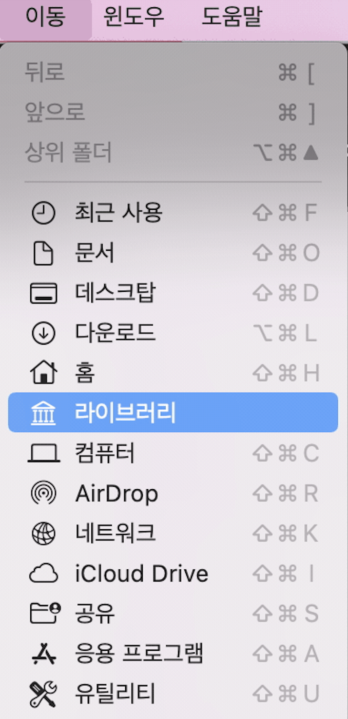 파인더를 열었다면 위의 메뉴에서 <이동> 탭에서 아래와 같이 라이브러리를 찾는다.