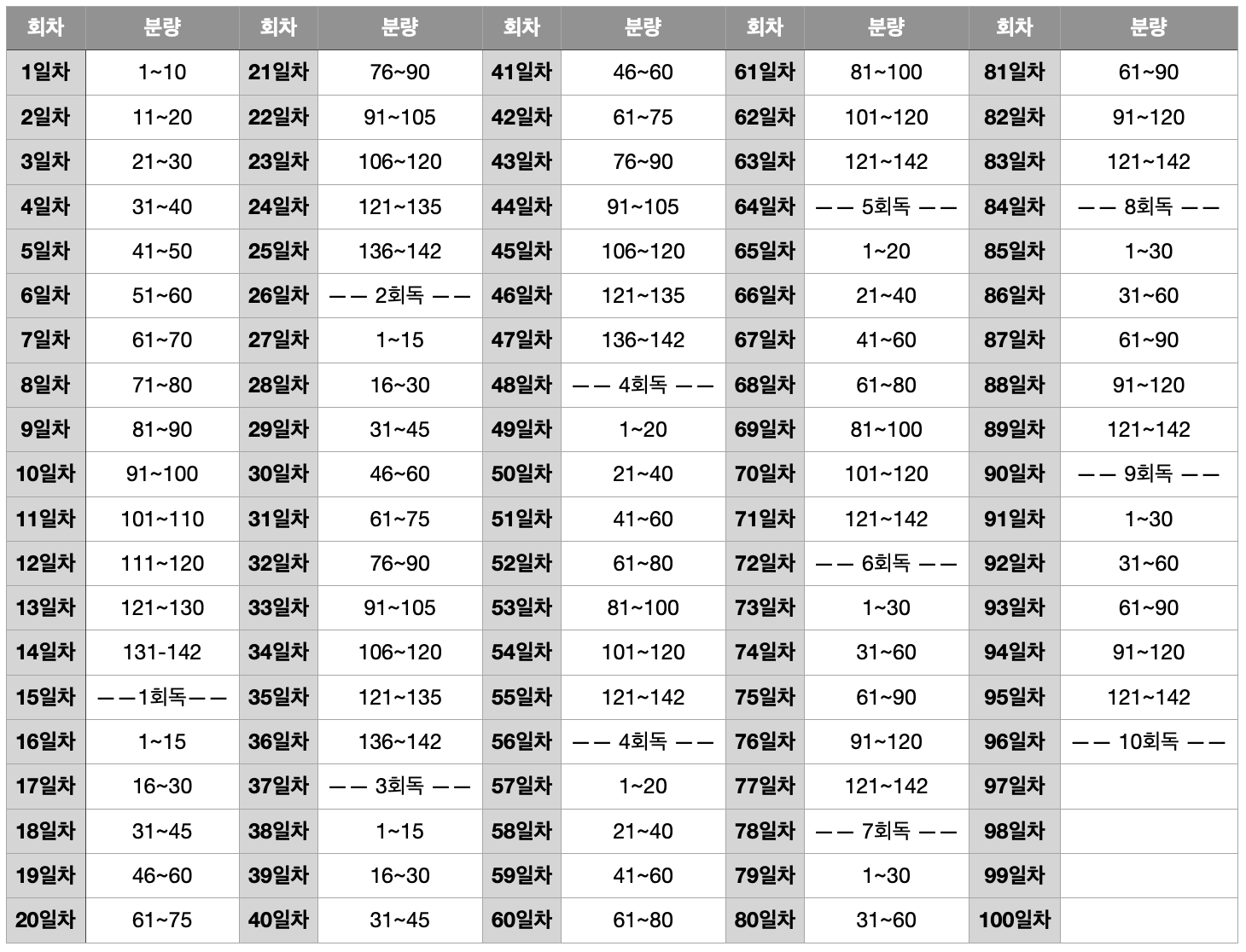 위와 같이 100일 계획을 만들어 실천하면 100일 내에 10 회독이 가능합니다.