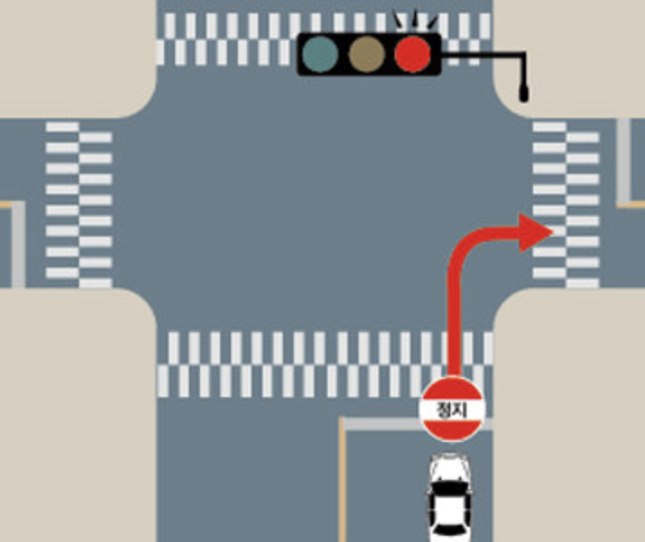- 우회전 신호등이 없는 경우에도 차량 신호등이 적색일 때에도 반드시 일시 정지한 후에 우회전해야 합니다.